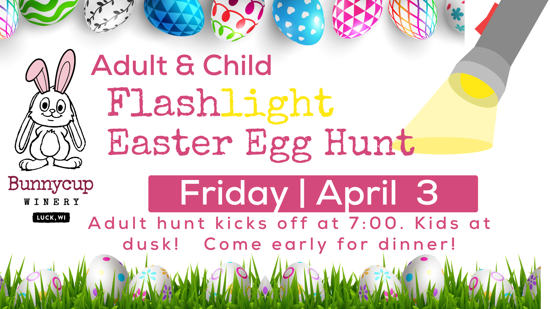 Kick off your Easter weekend with a fun, family-friendly Flashlight Easter Egg Hunt at Bunnycup Winery! We’ll have two hunts:• A kid-friendly hunt at dusk• An adult hunt in the vineyard starting at 7:00 PM (with wine prizes, of course) Make a night of it—come early for dinner! We’ll have flatbreads, warm Bavarian pretzels, and...